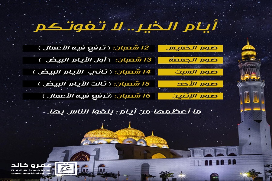 5 أيام احرص على صيامها في شعبان ليلة النصف من شعبان الأيام الثلاثة البيض في شعبان