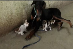 فيديو مؤثر| كلبة تتبنى ثلاثة قطط يتيمة وتقوم بإرضاعهم
