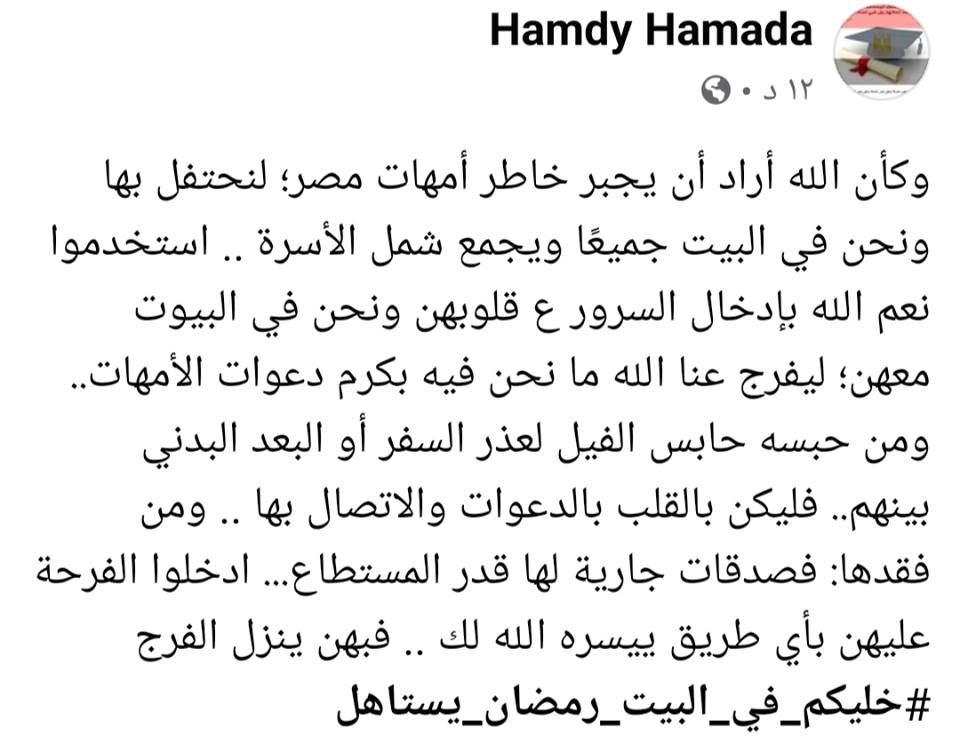 وكتب الدكتور حمدي حمادة "وكأن الله أراد أن يجبر خاطر أمهات مصر؛ لنحتفل بها ونحن في البيت جميعًا ويجمع شمل الأسرة .. استخدموا نعم الله بإدخال السرور ع قلوبهن ونحن في البيوت معهن؛ ليفرج عنا الله ما نحن فيه بكرم دعوات الأمهات.. ومن حبسه حابس الفيل لعذر السفر أو البعد البدني بينهم.. فليكن بالقلب بالدعوات والاتصال بها .. ومن فقدها: فصدقات جارية لها قدر المستطاع... ادخلوا الفرحة عليهن بأي طريق ييسره الله لك .. فبهن ينزل الفرج #خليكم_في_البيت_رمضان_يستاهل"
