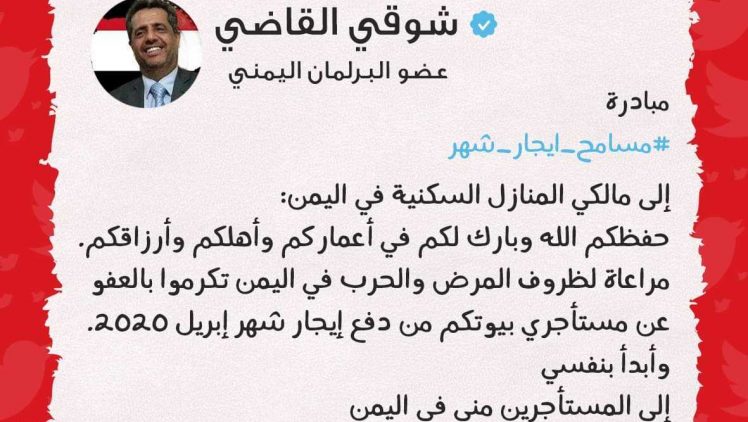 وقال ": "تكرموا بالعفو عن مستأجري بيوتكم من دفع إيجار أبريل 2020". وأضاف: "أبدأ بنفسي، إلى المستأجرين مني في اليمن، مسامح إيجار أبريل".
