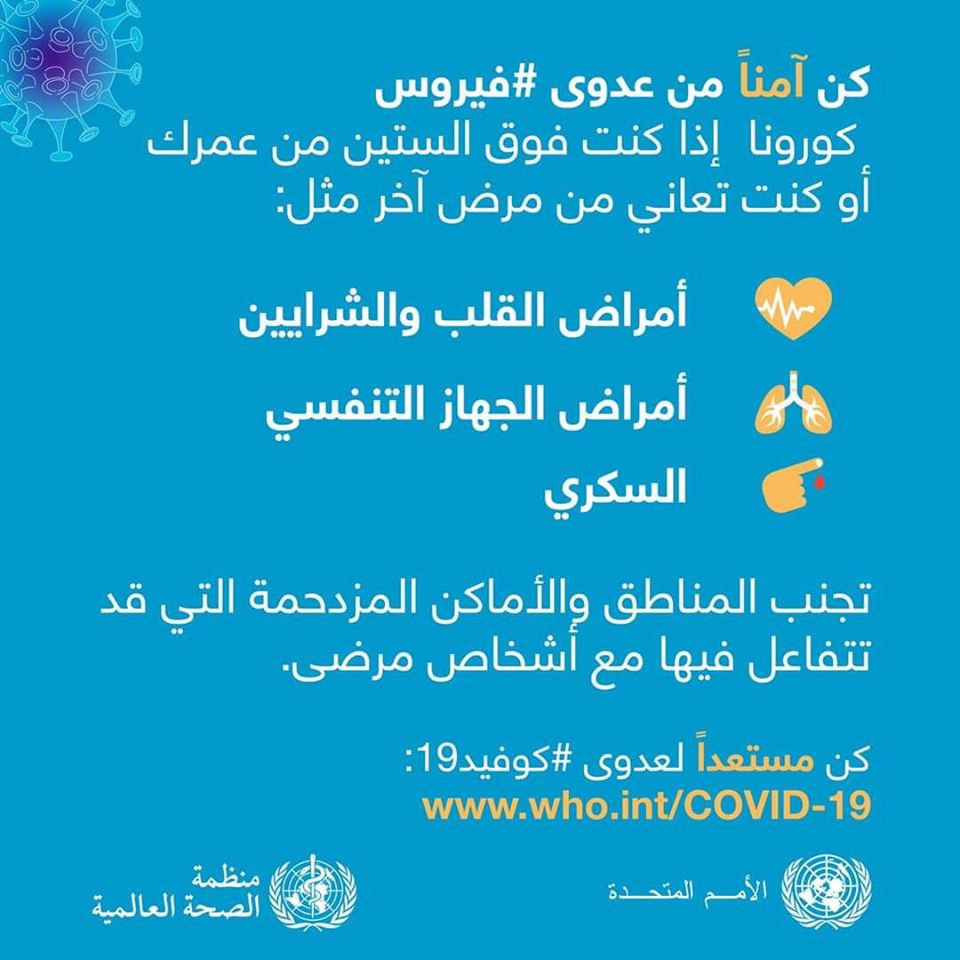 قدمت منظمة الصحة العالمية نصائح لكبار السن خاصة ذوي الأمراض منهم بأن يتوخوا الحذر في الاختلاط مع الآخرين، لتفادي الإصابة بفيروس كورونا.