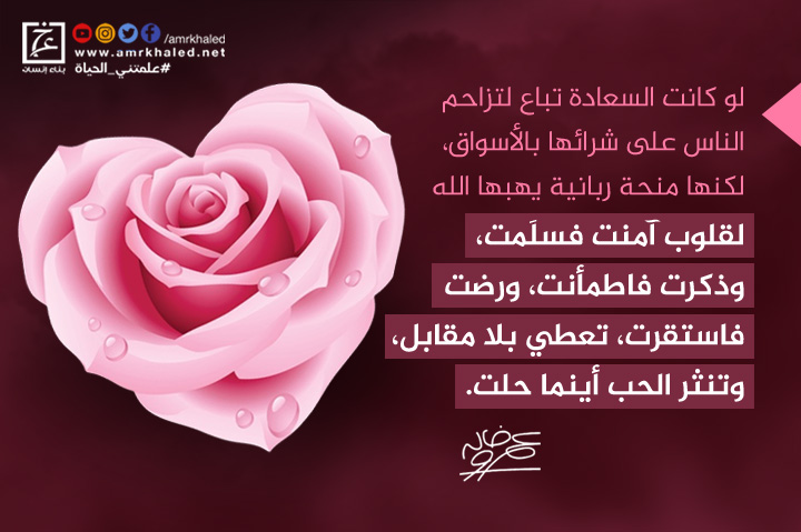 "لو كانت السعادة تباع لتزاحم الناس على شرائها بالأسواق، لكنها منحة ربانية يهبها الله لقلوب آمنت فسلَمت، وذكرت فاطمأنت، ورضت فاستقرت، تعطي بلا مقابل، وتنثر الحب أينما حلت".