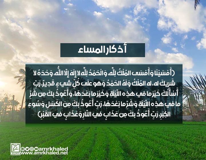 amrkhaled "أَمْسَيْنَا وَأَمْسَى الْمُلْكُ لِلَّهِ، وَالْحَمْدُ لِلَّهِ لَا إِلَهَ إِلَّا اللهُ، وَحْدَهُ لَا شَرِيكَ لَهُ، لَهُ الْمُلْكُ وَلَهُ الْحَمْدُ وَهُ