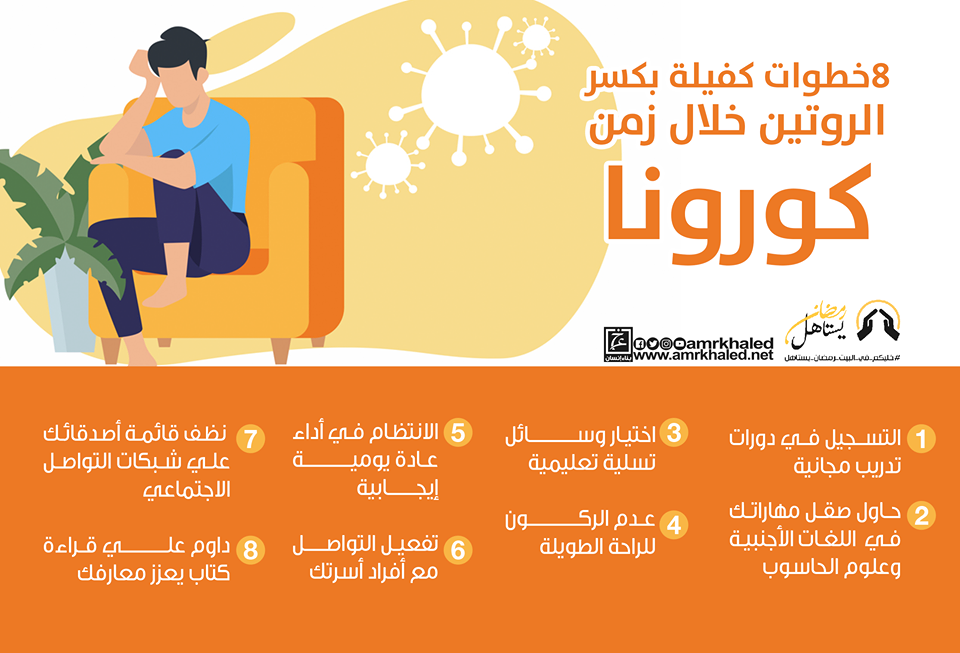 8خطوات كفيلة بكسر الروتين خلال زمن كورونا 1-التسجيل في دورات تدريب مجانية 2-حاول صقل مهاراتك في اللغات الأجنبية وعلوم الحاسوب 3-اختيار وسائل تسلية تعليمية 4-عدم الركون للراحة الطويلة 5-الانتظام في أداء عادة يومية إيجابية 6-تفعيل التواصل مع أفراد أسرتك 7- نظف قائمة أصدقائك علي شبكات التواصل الاجتماعي 8-داوم علي قراءة كتاب يعزز معارفك