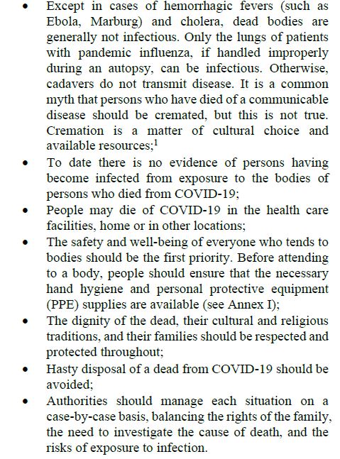 وفي ردها على موقعها عبر الإنترنت على سؤال: "هل هناك إجراءات خاصة للتصرف في جثث الأشخاص المتوفين نتيجة فيروس كورونا المستجد؟، قالت المنظمة: "لا، لا توجد هناك أي إجراءات خاصة للتصرف في جثث الأشخاص المتوفين نتيجة فيروس كورونا المستجد".