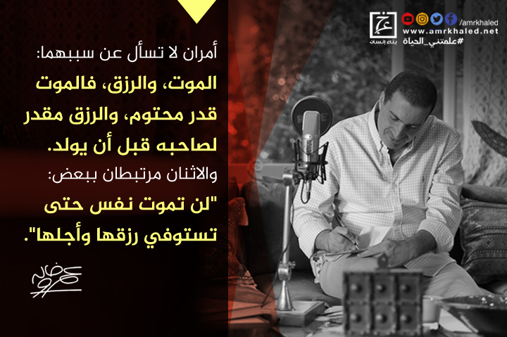 "أمران لا تسأل عن سببهما: الموت، والرزق، فالموت قدر محتوم، والرزق مقدر لصاحبه قبل أن يولد. والاثنان مرتبطان ببعض: {لن تموت نفس حتى تستوفي رزقها وأجلها}".
