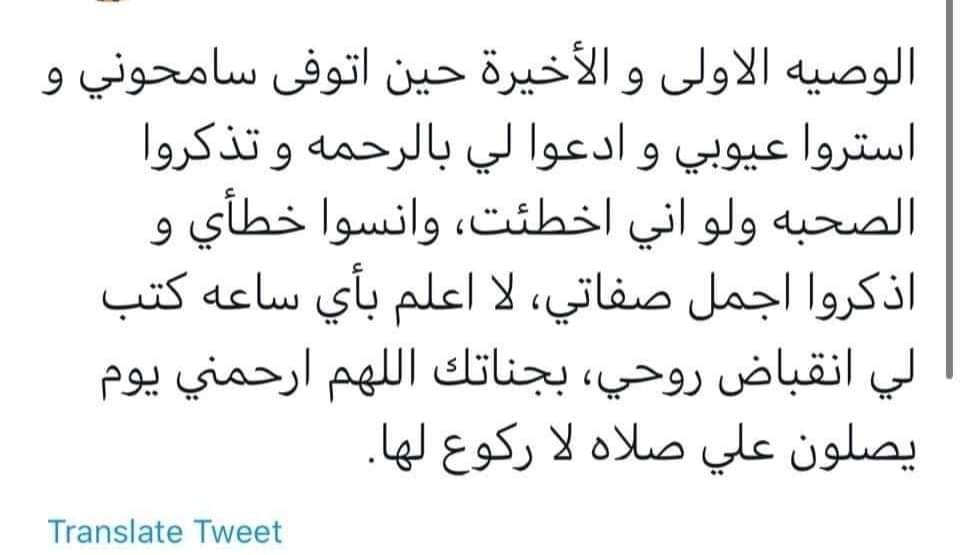 "الوصية الأولى والأخيرة حين اتوفى سامحوني واستروا عيوبي، وادعوا لي بالرحمة وتذكروا الصحبة ولو أني أخطأت، وانسوا خطأي واذكروا أجمل صفاتي. لا أعلم بأي ساعة كتب لي انقباض روحي، بجناتك اللهم ارحمني يوم يصلون علي صلاة لا ركوع لها".