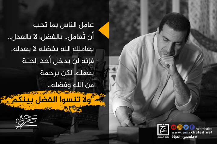 "عامل الناس بما تحب أن تُعامل.. بالفضل، لا بالعدل.. يعاملك الله بفضله لا بعدله. فإنه لن يدخل أحد الجنة بعمله، لكن برحمة من الله وفضله.. {ولا تنسوا الفضل بينكم}".