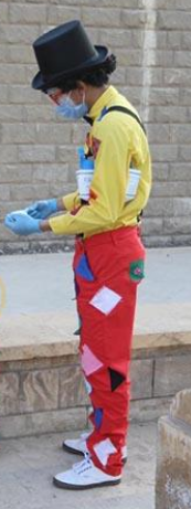 صور.. طالب مصري بكلية الهندسة يرتدي زي البلياتشو ويوزع الكمامات على أطفال المناطق الشعبية