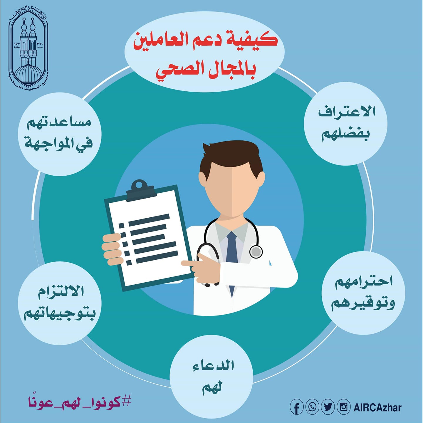 مجمع البحوث الاسلامية اصدر انفو جراف عن سبل دعم الاطباءوالعاملين في القطاع الطبي  في مواجهةفيروس كورونا تضمن ضرورة الاعتراف بفضلهم واحترامهم والتزام توجياهاتهم ودعمهم في المواجهة والدعاء