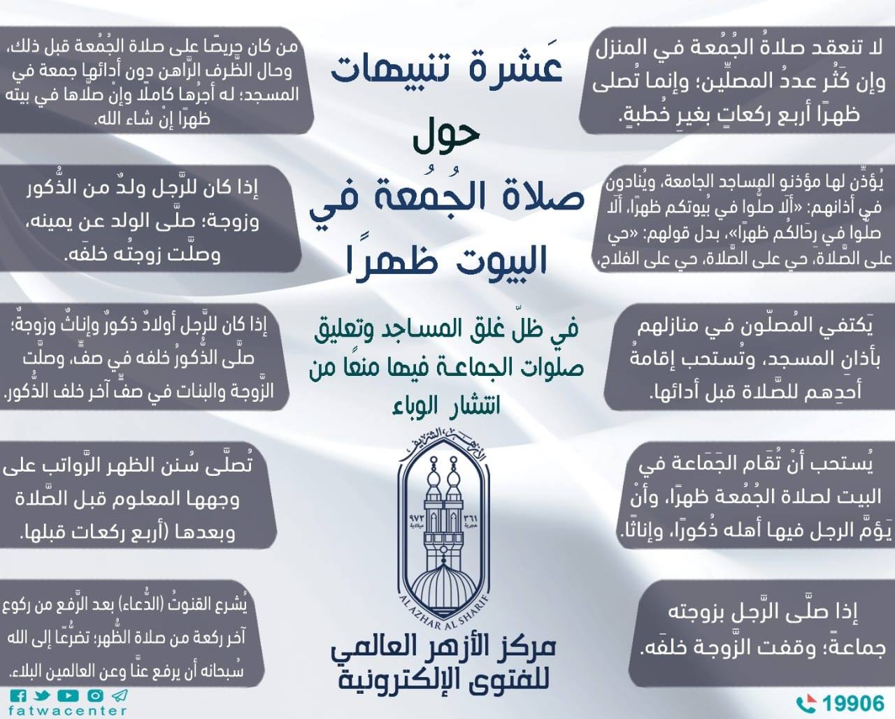 amrkhaled مركز الأزهر العالمي للفتوي الإليكترونية "انتج "انفو جراف" تضمن 10تنبيهات ينبغي علي من يؤدون صلاة الجمعة في البيت ظهرا يجب الاقتداء بها والحرص عليها