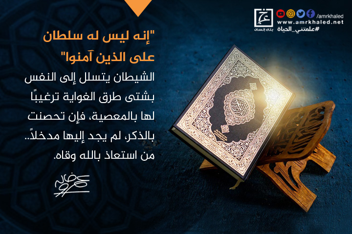 "{إنه ليس له سلطان على الذين آمنوا}، الشيطان يتسلل إلى النفس بشتى طرق الغواية ترغيبًا لها بالمعصية، فإن تحصنت بالذكر، لم يجد إليها مدخلاً.. من استعاذ بالله وقاه.