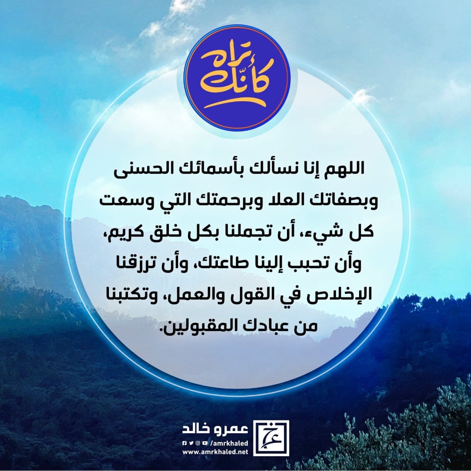 amrkhaled اللهم إنا نسألك بأسمائك الحسنى وبصفاتك العلا وبرحمتك التي وسعت كلّ شيءأن تجمعنا بكل خلق كريم وأن تحبب إلينا طاعتك وأن ترزقنا الإخلاص في القول والعمل و