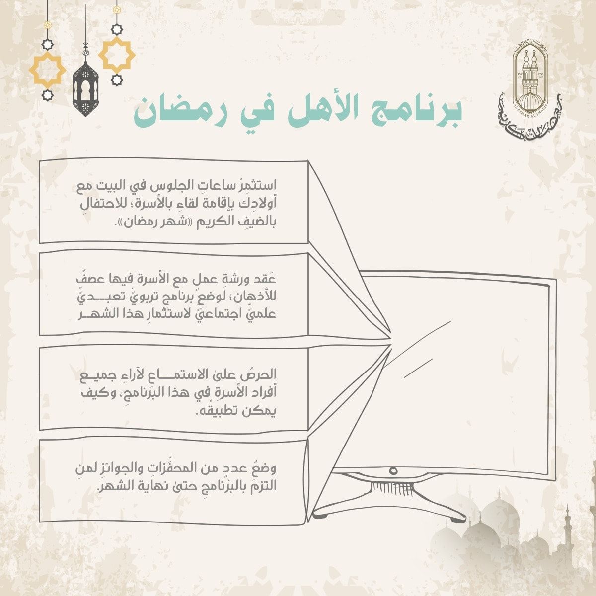 الصفحة الرسمية للأزهر الشريف علي شبكة التواصل الاجتماعي وضعت تصورا من خلال الانفو جراف لوضع برنامج تعبدي تربوي خلال الشهر الكريم تتضمن عديدا من الخطوات التي يمكن منه خلالها صياغة هذاالبرنامج ووضعه بالتشاور مع الأسرة للخروج من رمضان بأعظم الثواب واغتنام الأجواءالروحانية لمزيد من الطاعات .