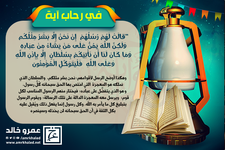 "قَالَتْ لَهُمْ رُسُلُهُمْ إِنْ نَحْنُ إِلَّا بَشَرٌ مِثْلُكُمْ وَلَٰكِنَّ اللَّهَ يَمُنُّ عَلَىٰ مَنْ يَشَاءُ مِنْ عِبَادِهِ ۖ وَمَا كَانَ لَنَا أَنْ نَأْتِيَكُمْ بِسُلْطَانٍ إِلَّا بِإِذْنِ اللَّهِ ۚ وَعَلَى اللَّهِ فَلْيَتَوَكَّلِ الْمُؤْمِنُونَ" ( إبراهيم : 11)