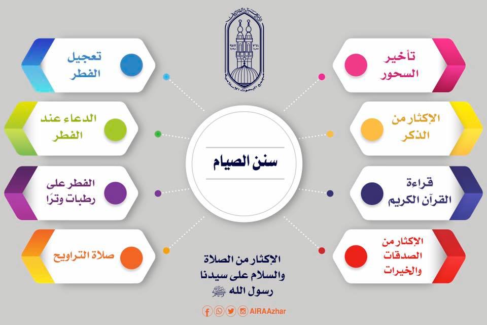 الإفطار علي رطبات وترا وأداء صلاة التراويح والإكثار من الصلاة علي النبي 3سنن حث أنفو مجمع البحوث الإسلامية علي اغتنامها خلال الشهر الكريم.