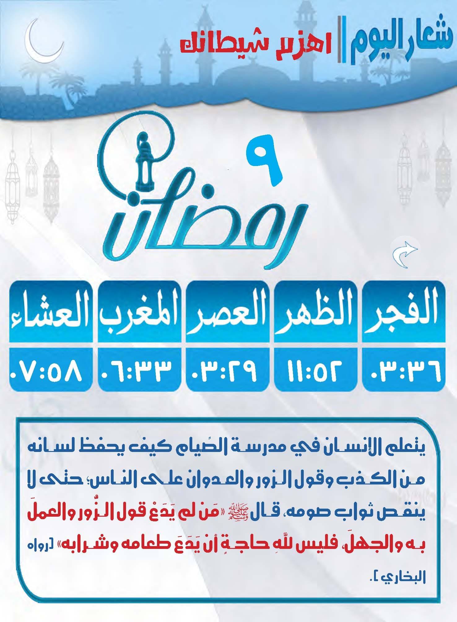 يحل مو عد صلاة المغرب في اليوم التاسع من رمضان في الساعة السادسة و33دقيقة فيما يرفع الآذان لصلاة العشاء في السابعة و58دقيقة
