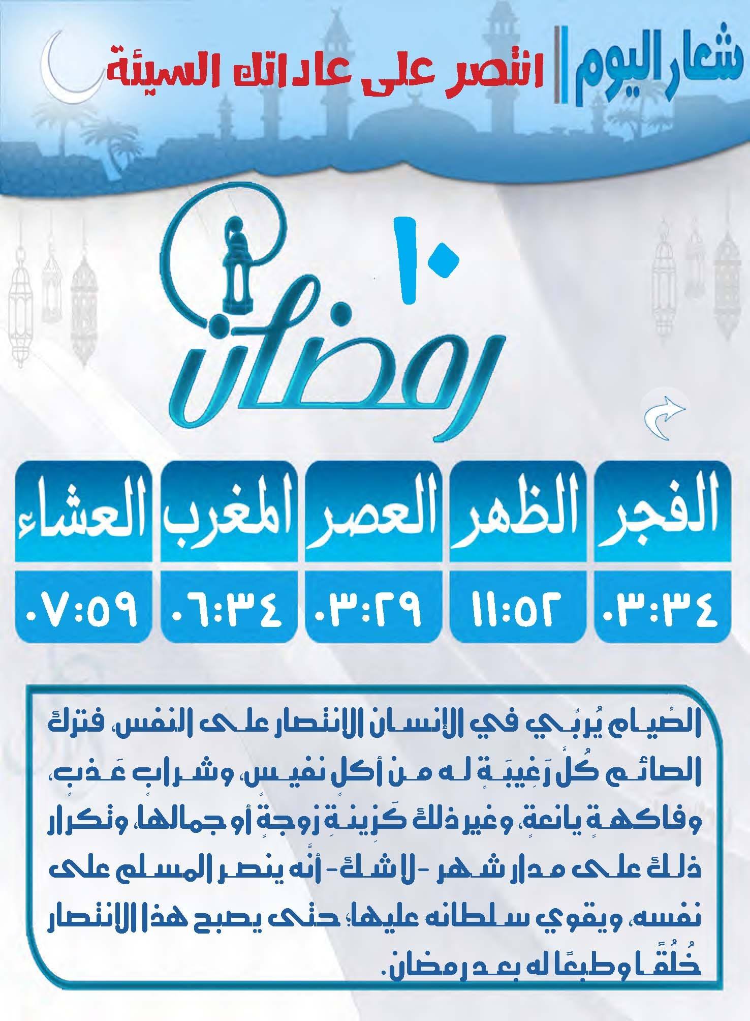 يحل مو عد صلاة المغرب في اليوم العاشر من رمضان في الساعة السادسة و34دقيقة فيما يرفع الآذان لصلاة العشاء في السابعة و59دقيقة