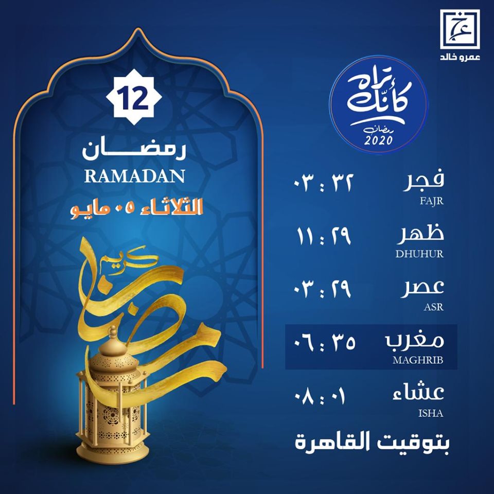 amrkhaled مواقيت الصلاة وموعد أذان المغرب ليوم الثلاثاء 12 رمضان
