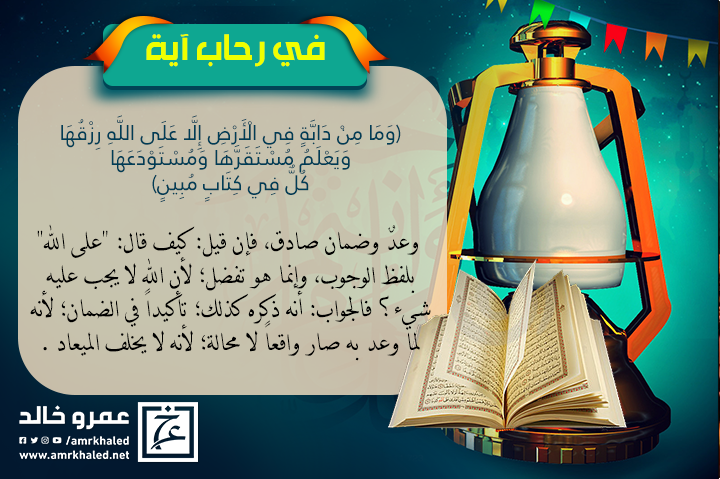 "وَمَا مِنْ دَابَّةٍ فِي الْأَرْضِ إِلَّا عَلَى اللَّهِ رِزْقُهَا وَيَعْلَمُ مُسْتَقَرَّهَا وَمُسْتَوْدَعَهَا كُلٌّ فِي كِتَابٍ مُبِينٍ"