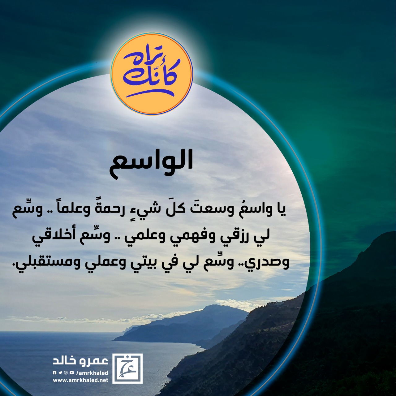 amrkhaled "يا واسع وسعت كل شئ رحمة وعلما وسعلي رزقي وفهمي وعلمي وسع اخلاقي وصدر ووسع لي فيبيتي وعملي ومستقبلي "