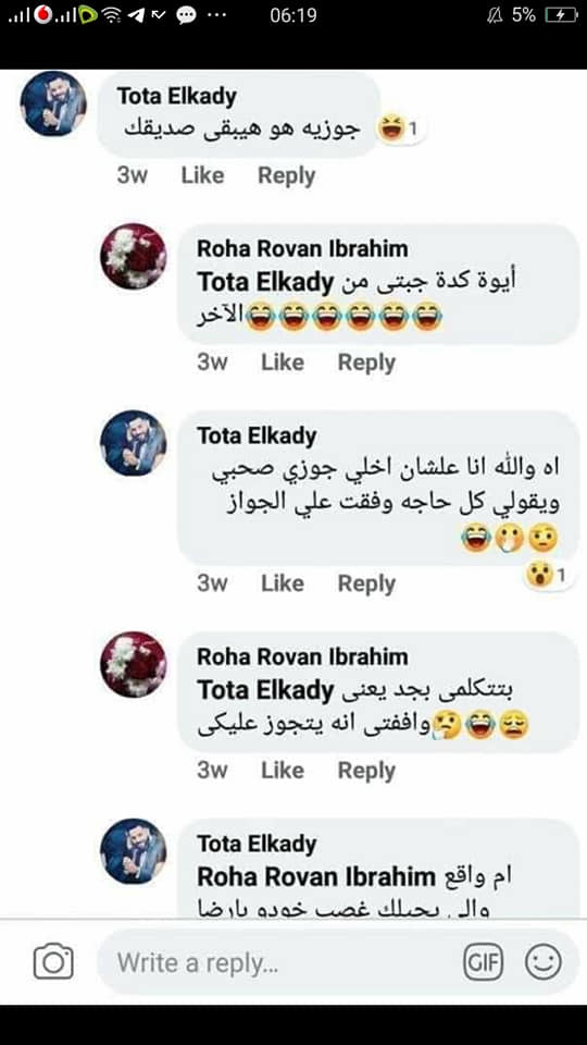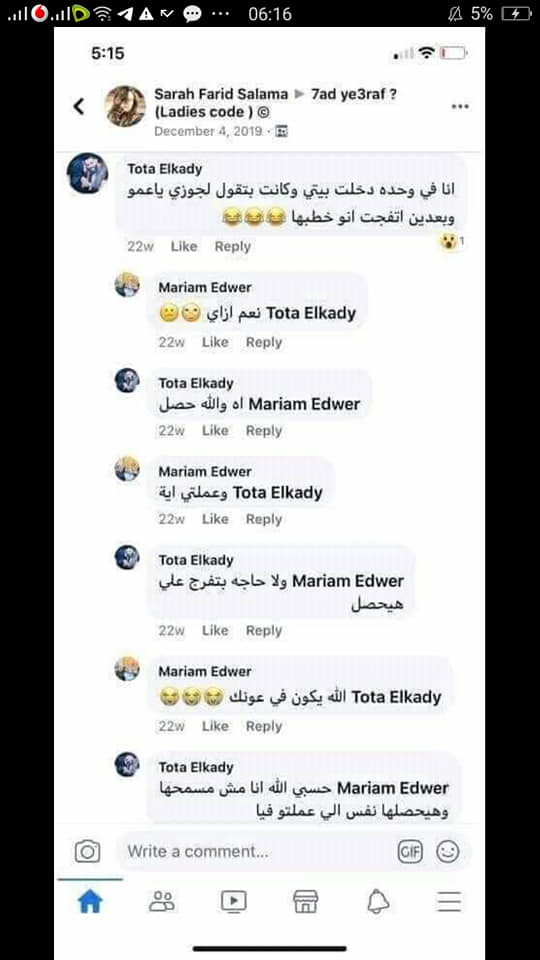 في حين أنه تم التقاط بعض التعليقات لها على إحدى جروبات الفتيات توضح أن "نعمة" كانت صديقتها بالفعل وتزوجت زوجها.