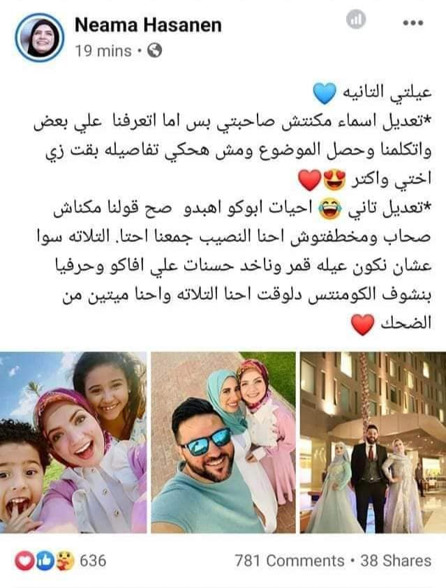 زاد من الجدل ما كتبت الزوجة الأولى عبر صفحتها على "فيس بوك": "أنا راضية انتوا مالكوا والشرع محللة أربعة وأحسن ما يعمل حاجة حرام من ورايا وأنا ونعمة صحاب وعايشين كلنا عيلة مع بعض".