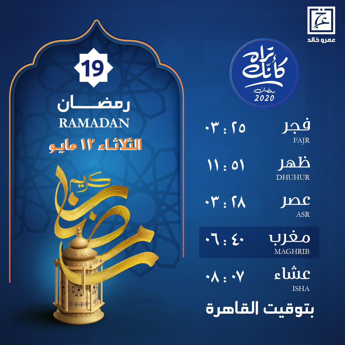 amrkhaled مواقيت الصلاة وموعد أذان المغرب ليوم الثلاثاء 19 رمضان