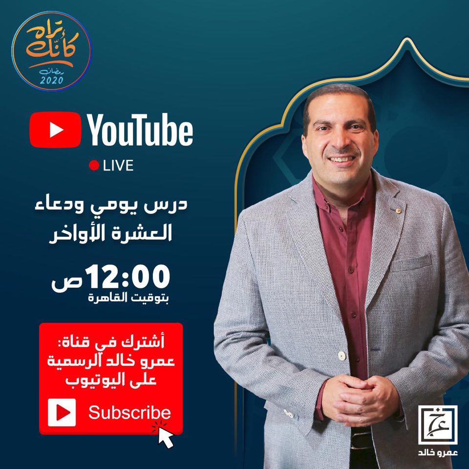 أعلن الداعية الإسلامي الدكتور عمرو خالد أنه سيلتقي مع متابعيه طوال العشر الأواخر من رمضان الساعة ١٢ منتصف الليل بتوقيت القاهرة من خلال درس يومه علي قناته علي اليوتيوب..ويمكن متابعته على الرابط التالي: