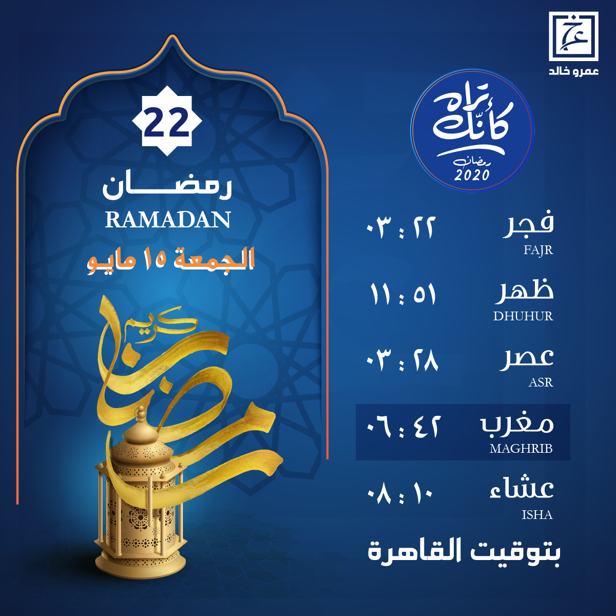 amrkhaled مواقيت الصلاة وموعد الإفطار ليوم الجمعة 22 رمضان