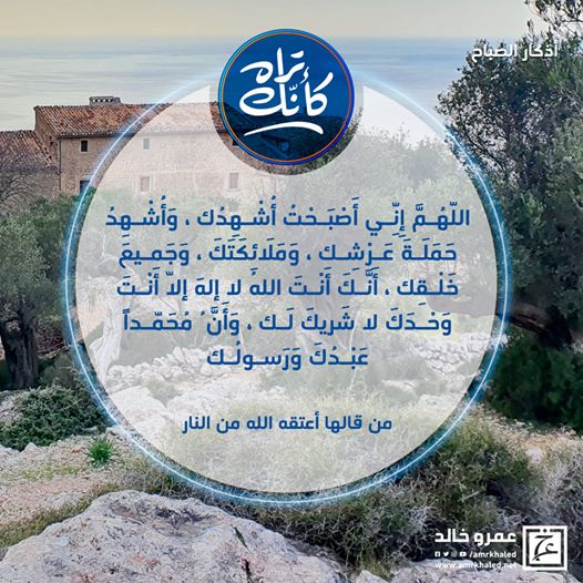 amrkhaled "اللهم إني أصبحت أشهدك وأشهد حملة عرشك وملائكتك وجميع خلقك، أنك أنت الله لا إله إلا أنت، وأن محمداً عبدك ورسولك،"
