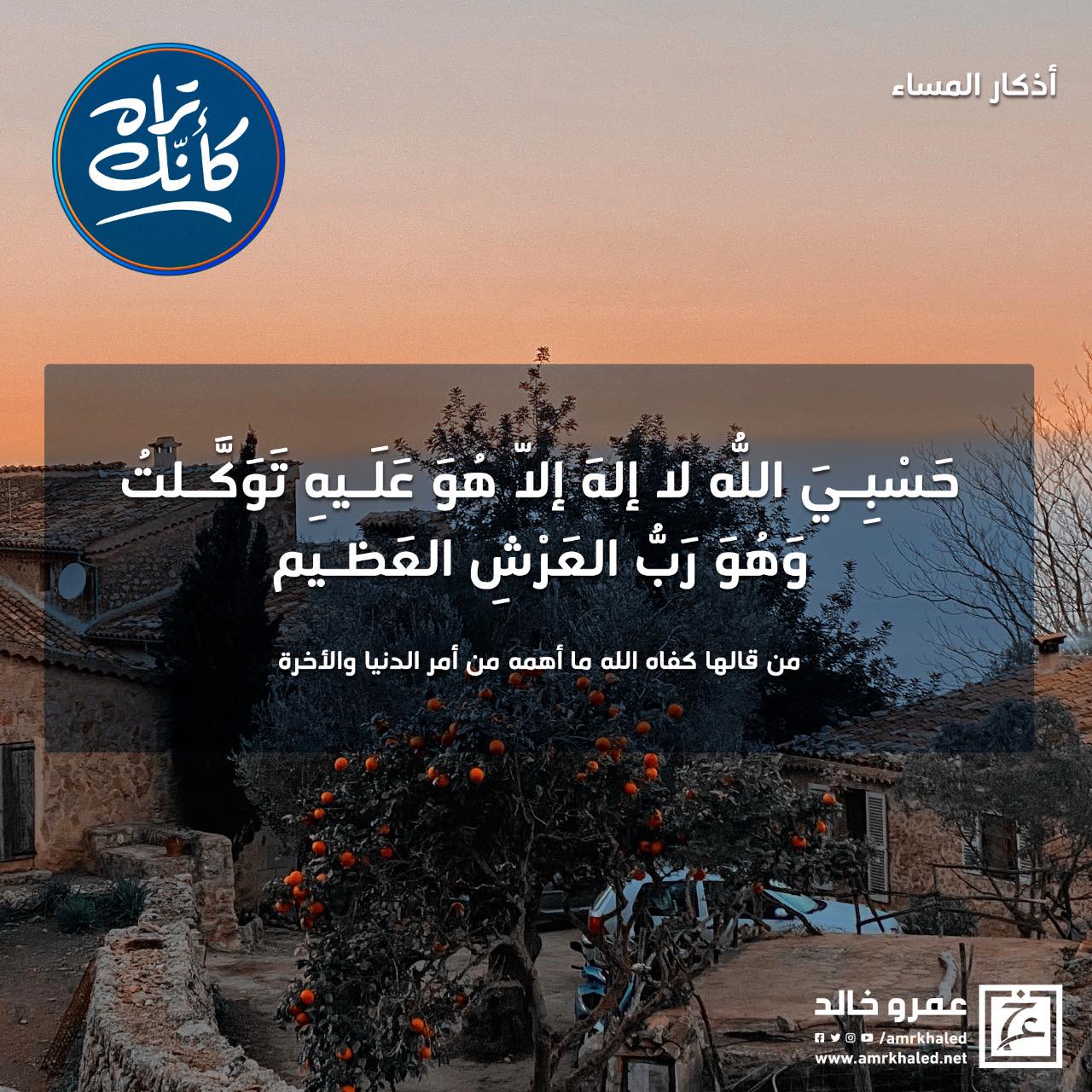 amrkhaled "حسبي الله لا أله توكلت وهو رب العرش العظيم " من قالها حين يمسي كفاه الله ما أهمه من أمر الدنيا والآخرة
