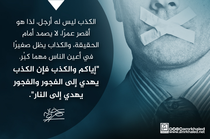 "الكذب ليس له أرجل، لذا هو أقصر عمرًا، لا يصمد أمام الحقيقة، والكذاب يظل صغيرًا في أعين الناس مهما كبر (إياكم والكذب فإن الكذب يهدي إلى الفجور والفجور يهدي إلى النار)".