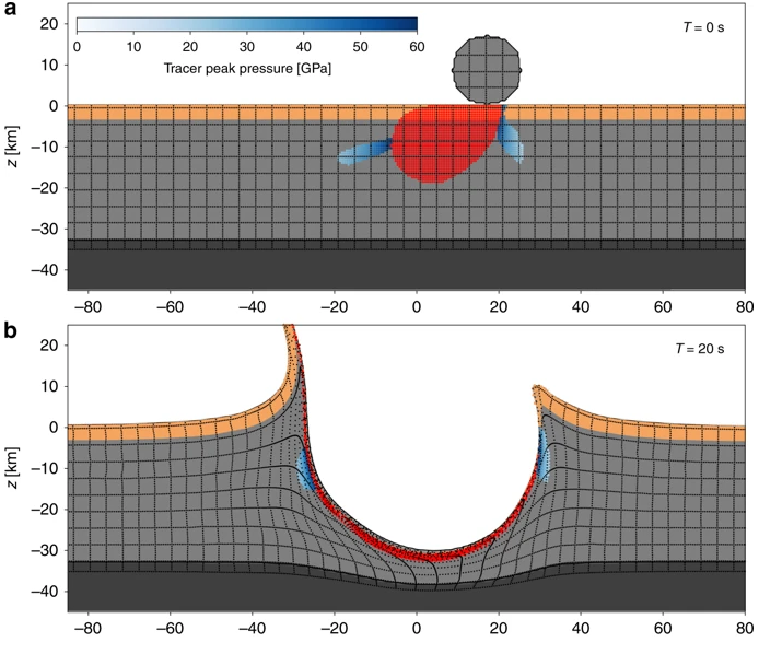 وقام فريق الباحثين من إمبريال وجامعة فرايبورغ وجامعة تكساس في أوستن، بفحص شكل الحفرة الموجودة بالمكسيك، هيكلها تحت السطح باستخدام البيانات الجيوفيزيائية لتغذية المحاكاة التي ساعدت في تشخيص زاوية التصادم والاتجاه، وقد استند تحليلهم أيضًا إلى النتائج الأخيرة من الحفرة التي يبلغ عرضها 200 كيلومتر.