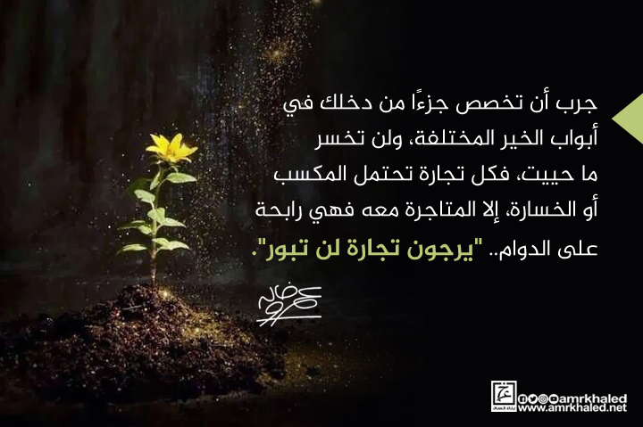 "جرب أن تخصص جزءًا من دخلك في أبواب الخير المختلفة، ولن تخسر ما حييت، فكل تجارة تحتمل المكسب أو الخسارة، إلا المتاجرة معه فهي رابحة على الدوام.. {يرجون تجارة لن تبور}".