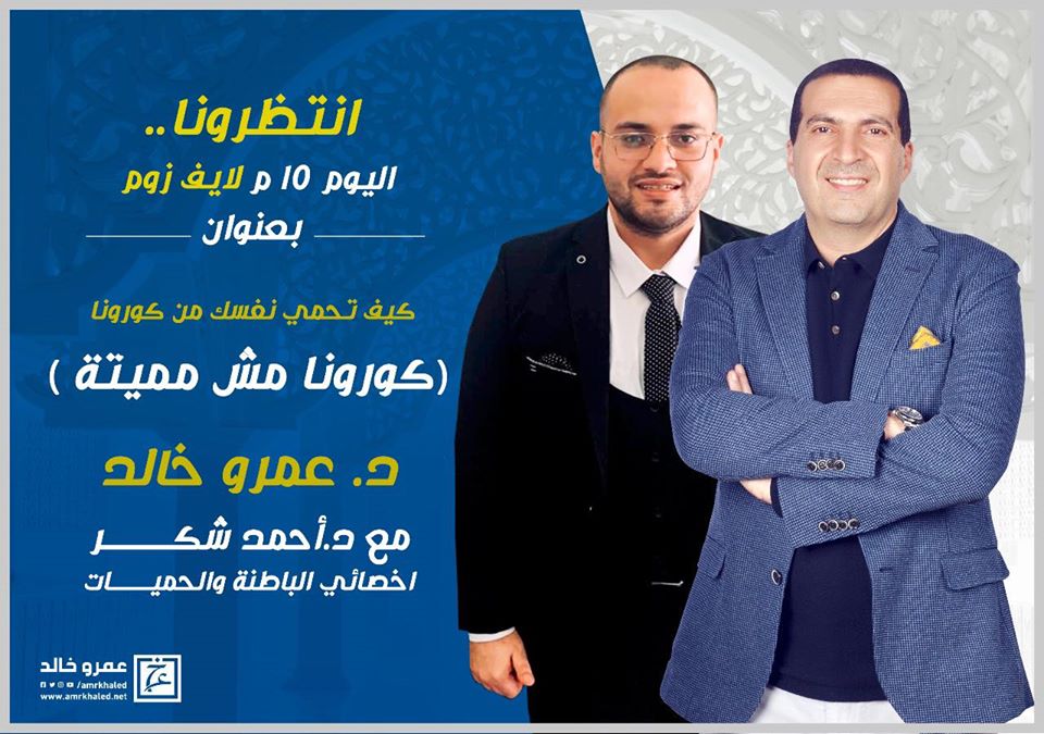 يطل الداعية الإسلامي الدكتور عمرو خالد على متابعيه بعد قليل في الساعة العاشرة مساء بتوقيت القاهرة.من خلال صفحته الرسمية على موقع التواصل الاجتماعي "فيس بوك" في (لايف زوم) بمشاركة الدكتور  أحمد شكر أخصائي الباطنة والحميات تحت عنوان ( كورونا مش مميتة).