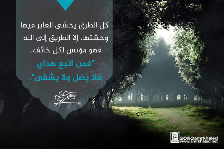 amrkhaled "كل الطرق يخشى العابر فيها وحشتها، إلا الطريق إلى الله فهو مؤنس لكل خائف.. {فمن اتبع هداي فلا يضل ولا يشقى}".