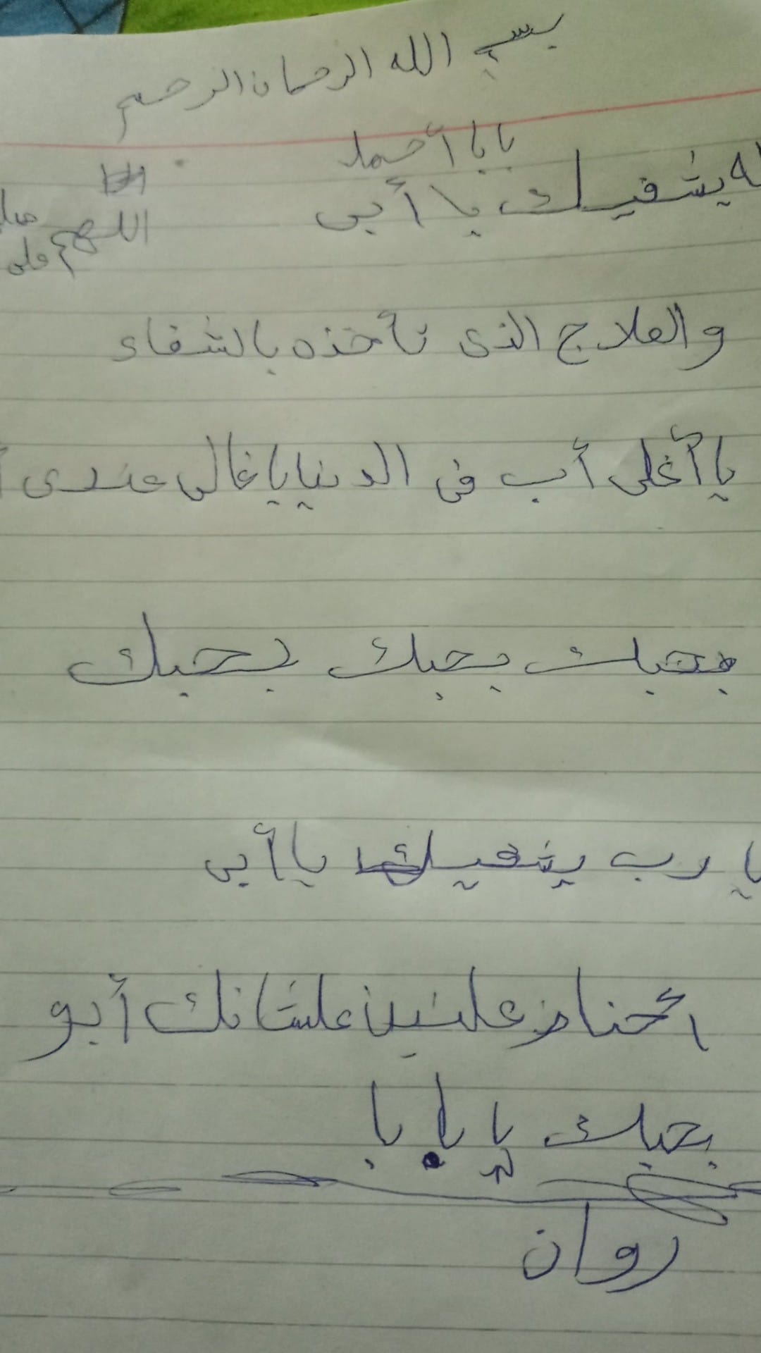 "بسم الله الرحمن الرحيم، بابا أحمد، الله يشفيك يا أبي، والعلاج الذى تأخذه بالشفاء، يا أغلى أب في الدنيا، ياغالي عندي، بحبك بحبك بحبك، ربنا يشفيك يا أبي، إحنا زعلنين علشان أوي، بحبك يا بابا".