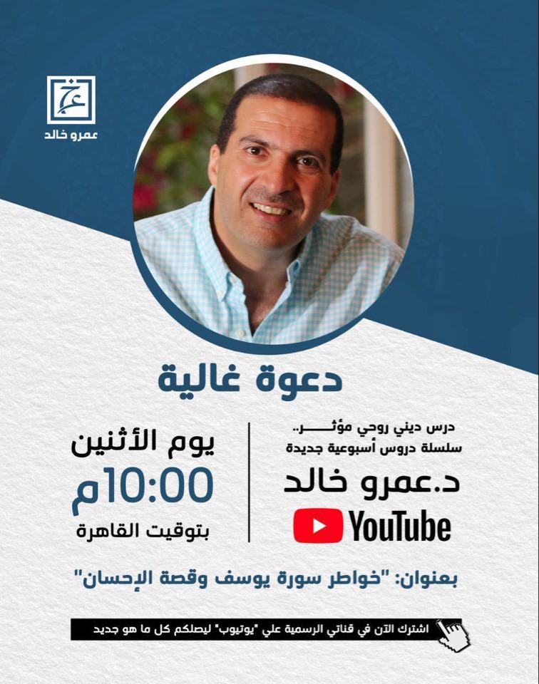 في أولى حلقات دروس خواطر سورة يوسف وقصة الإحسان، قال الداعية الإسلامي الدكتور عمرو خالد إن هذه الخواطر سوف تستغرق عاماً كاملاُ من خلال درس أسبوعي على قناة يوتيوب ومدة الدرس ربع ساعة يتناول قصة يوسف عليه السلام برؤية جديدة ، ويجب أن نكون مستعدين لحفظ سورة يوسف وهي 111 آية .