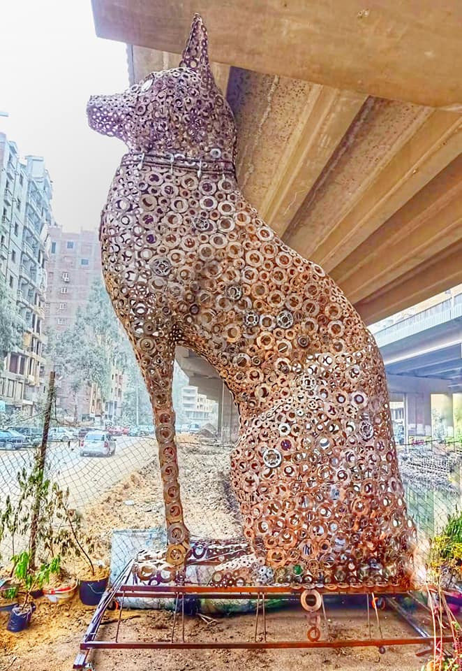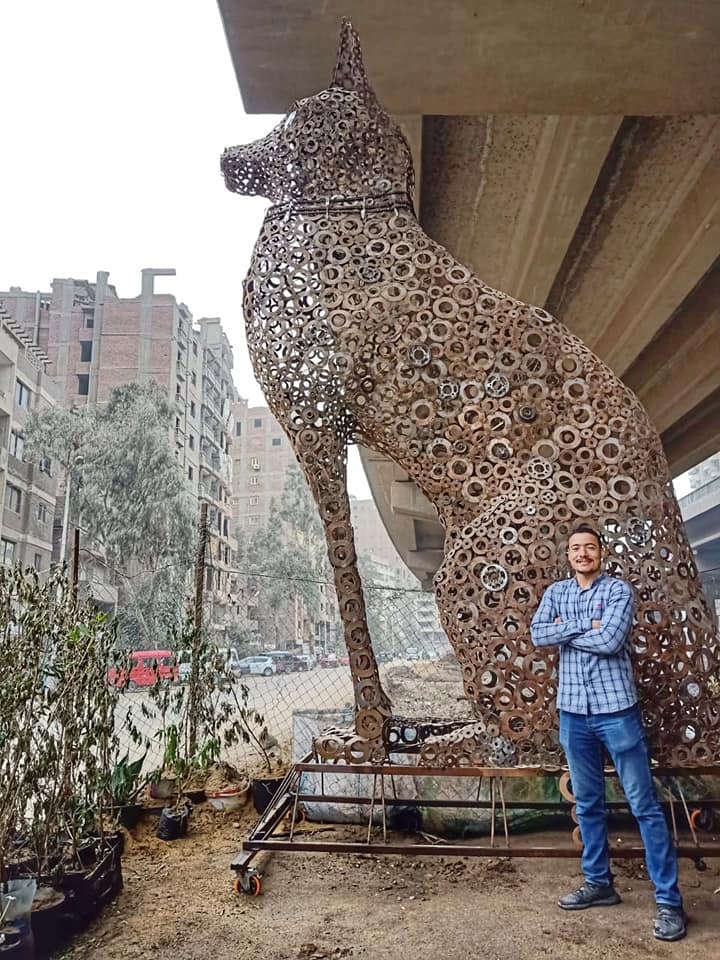 فقد استطاع أن يستخدم الخردة في تصنيع تمثال ضخم على شكل القط الفرعوني "باستت" الذي كان يعتبره المصريون القدماء، "إله الحماية" – وفق معتقدهم - بارتفاع 6 أمتار ووزن نصف طن من الحديد مصنوع من مواد الخردة.