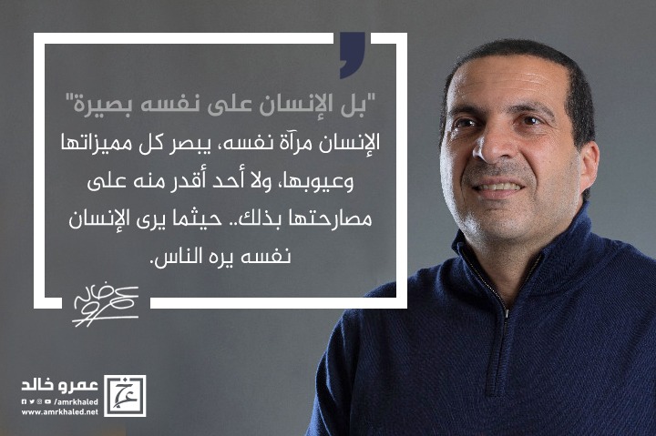 amrkhaled "بل الإنسان على نفسه بصيرة"، الإنسان مرآة نفسه، يبصر كل مميزاتها وعيوبها، ولا أحد أقدر منه على مصارحتها بذلك.. حيثما يرى الإنسان نفسه يره الناس.