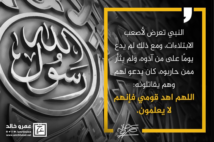 amrkhaled "النبي تعرض لأصعب الابتلاءات، ومع ذلك لم يدع يومًا على من آذوه، ولم يثأر ممن حاربوه، كان يدعو لهم وهم يقاتلونه: (اللهم اهد قومي فإنهم لا يعلمون)".