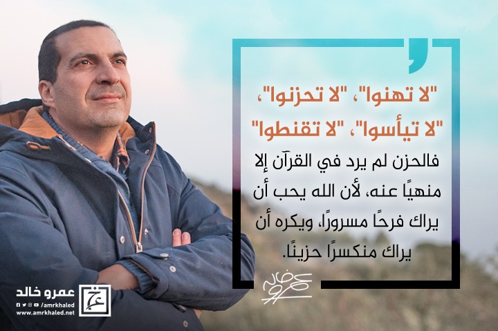 ("لا تهنوا"، "لا تحزنوا"، "لا تيأسوا"، "لا تقنطوا"، فالحزن لم يرد في القرآن إلا منهيًا عنه، لأن الله يحب أن يراك فرحًا مسرورًا، ويكره أن يراك منكسرًا حزينًا).