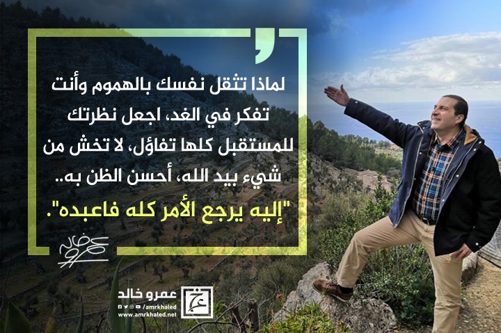 amrkhaled "لماذا تثقل نفسك بالهموم وأنت تفكر في الغد، اجعل نظرتك للمستقبل كلها تفاؤل، لا تخش من شيء بيد الله، أحسن الظن به.. {إليه يرجع الأمر كله فاعبده}".