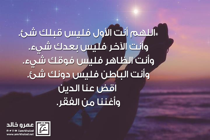 وفي صحيح مسلم عن أبي هريرة : أن النبي صلى الله عليه وسلم كان إذا أوى إلى فراشه قال: اللهم ربّ السموات، وربّ الأرض، وربّ العرش العظيم، ربنا وربّ كل شيء، فالق الحب والنوى، ومنزل التوراة والإنجيل والفرقان، أعوذ بك من شرِّ كل ذي شرٍّ أنت آخذٌ بناصيته، أنت الأول فليس قبلك شيء، وأنت الآخر فليس بعدك شيء، وأنت الظاهر فليس فوقك شيء، وأنت الباطن فليس دونك شيء، اقضِ عنَّا الدَّيْنَ وأغننا من الفقر.