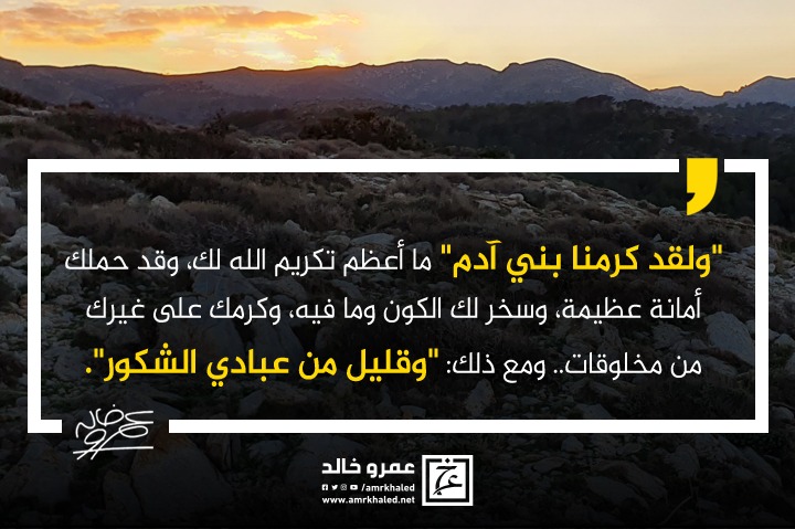 "{ولقد كرمنا بني آدم}، ما أعظم تكريم الله لك، وقد حملك أمانة عظيمة، وسخر لك الكون وما فيه، وكرمك على غيرك من مخلوقات.. ومع ذلك: {وقليل من عبادي الشكور}".