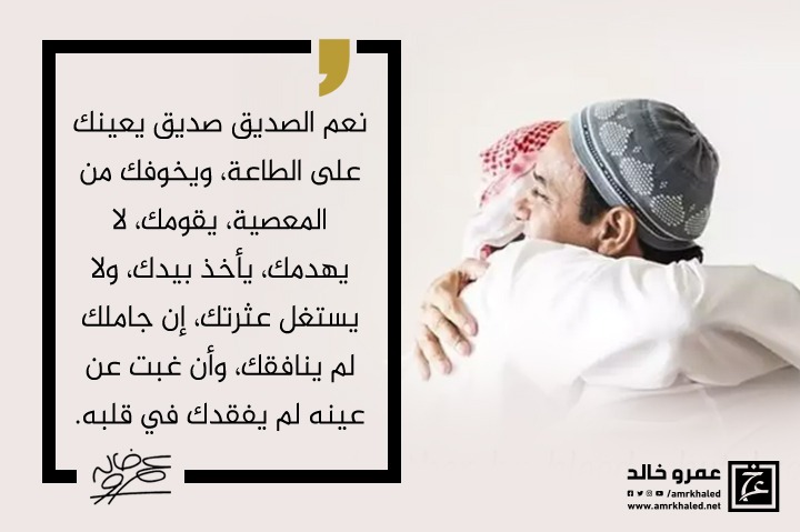 amrkhaled "نعم الصديق صديق يعينك على الطاعة، ويخوفك من المعصية، يقومك، لا يهدمك، يأخذ بيدك، ولا يستغل عثرتك، إن جاملك لم ينافقك، وأن غبت عن عينه لم يفقدك في