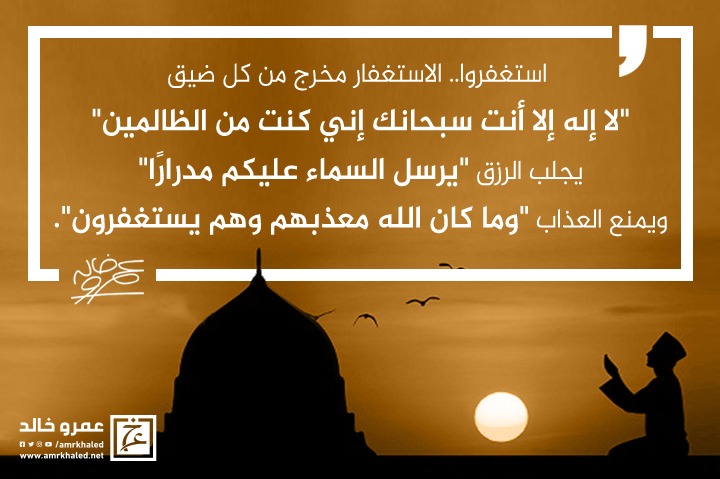 "استغفروا.. الاستغفار مخرج من كل ضيق {لا إله إلا أنت سبحانك إني كنت من الظالمين}،يجلب الرزق {يرسل السماء عليكم مدرارًا}،ويمنع العذاب {وما كان الله معذبهم وهم يستغفرون}".