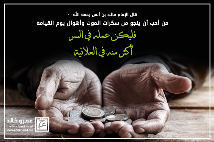 قال الإمام مالك بن أنس رحمه الله : " من أحب أن ينجو من سكرات الموت وأهوال يوم القيامة فليكن عمله في السر أكثر منه في العلانية