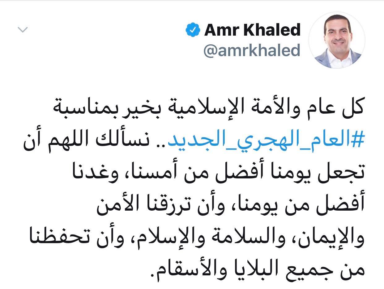 هنأ الداعية الإسلامي الدكتور عمرو خالد الأمتين العربية والإسلامية بالعام الهجري الجديد متمنيا للجميع الرقي والسعادة في يومه ومستقبله.